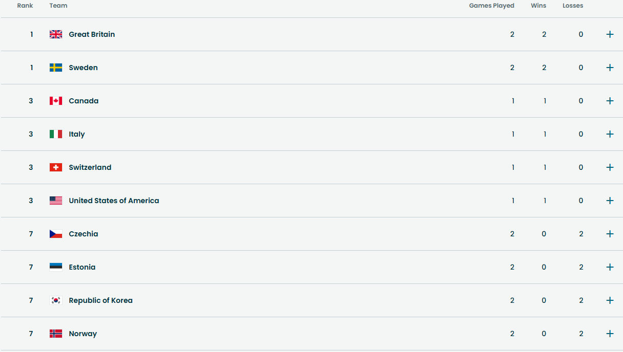 Tabulku vedou týmy Velké Británie a Švédska, které mají na kontě dvě výhry.